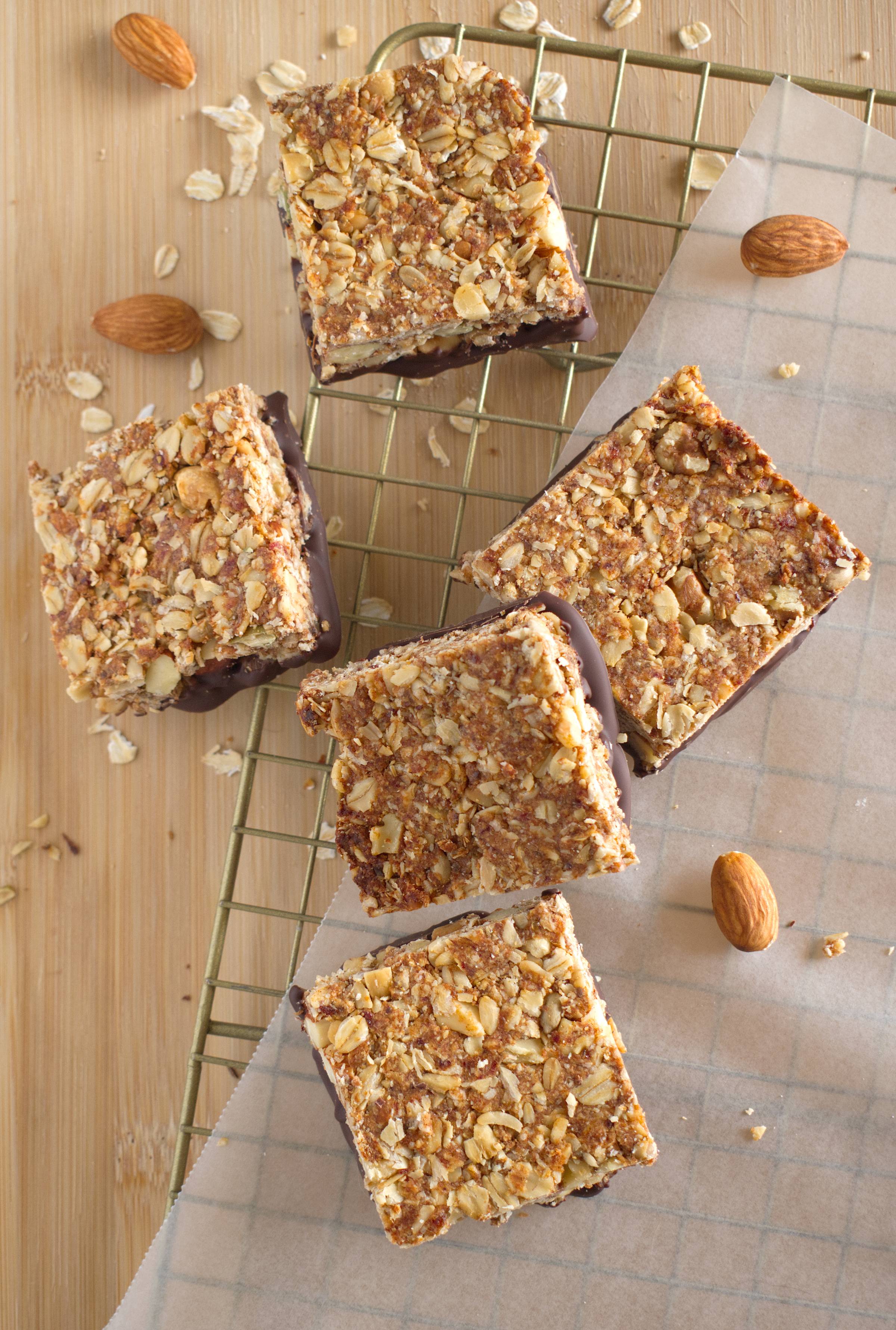 - Cut into 16 squares and tada! They’re delicious as-is, but if you want to go a step further: melt the chocolate over a double boiler and dip the bottoms of the bars.