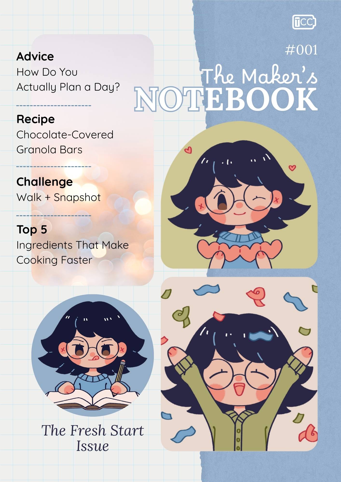 With some thinking, I came up with the idea of turning my newsletter into a magazine-style hybrid! With a cover, an advice column, an original recipe, personal recommendations, challenges and some goodies.